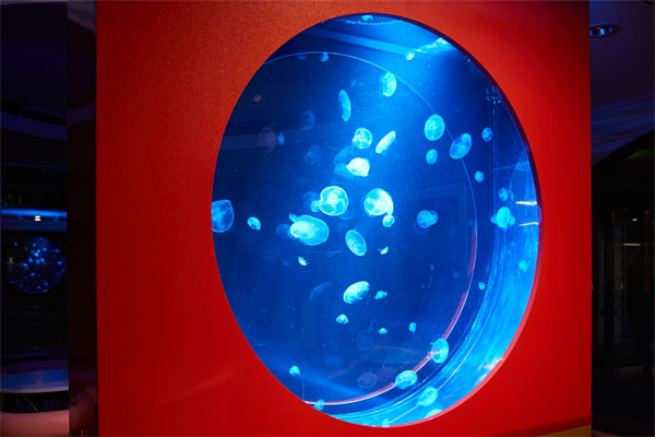 待合室・ロビーと、受付の写真、設置されているクラゲの水槽の写真です。